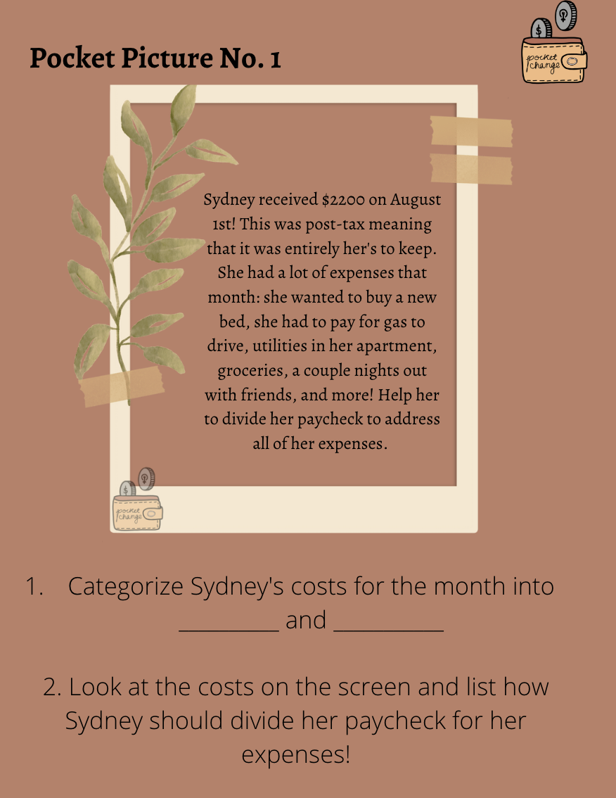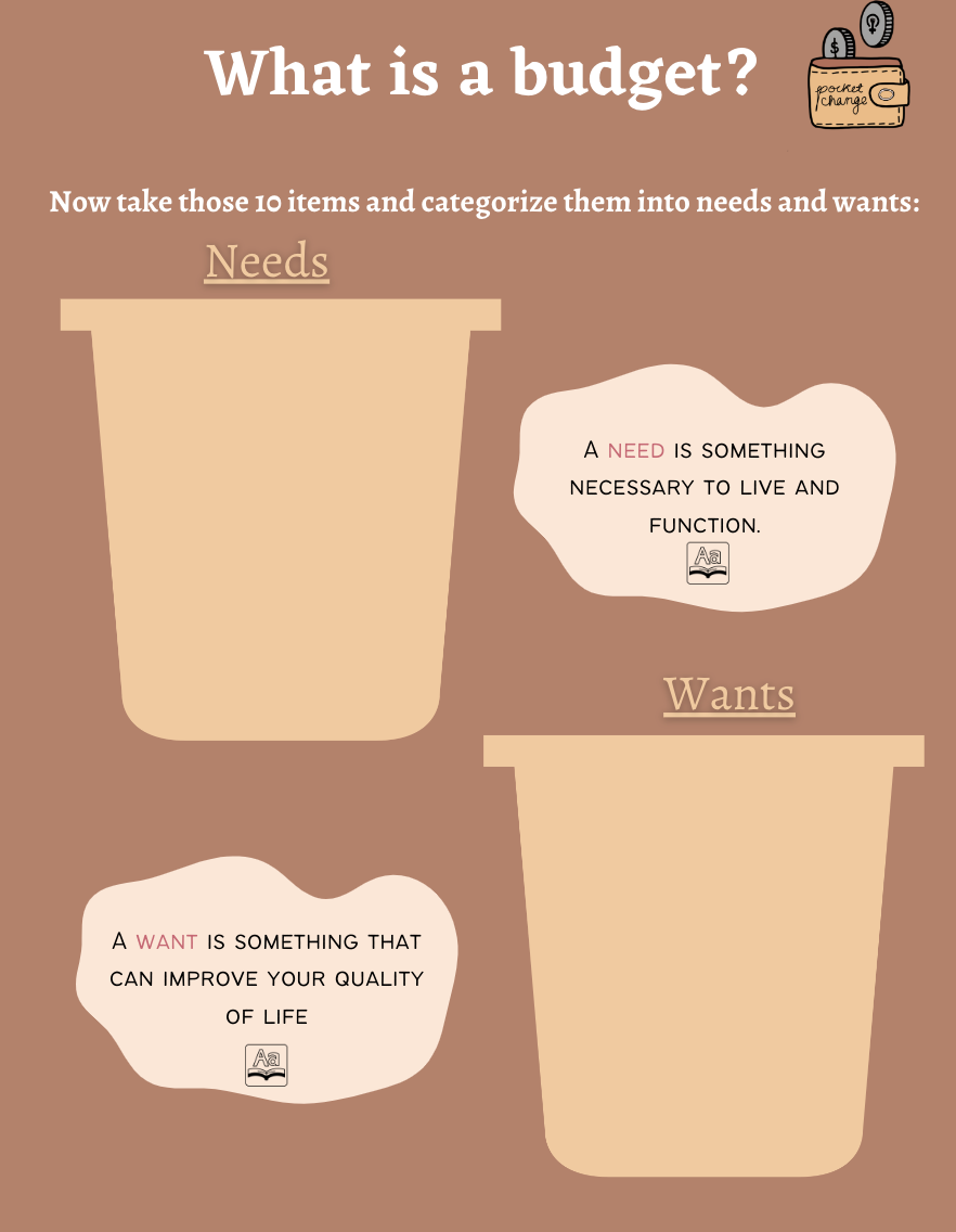 Workshops encourage students to apply lessons learned to thier own life; this example from our Budgeting and Saving lesson involves categorizing personal expenditures